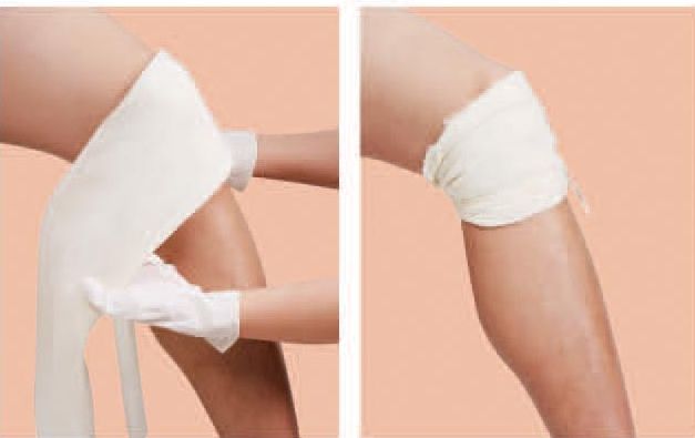 将胶布剪成宽约2cm左右、长为小腿周径一圈半的若干条。先将患处用0.9%等渗盐水清洗干净,将胶布条一条一条“叠瓦状”把疮面封拄,封出疮面上下缘2cm,包扎须稍用力,使胶布的中段正贴疮面。老烂腿患者分泌物少,每周换药1次;分泌物多而有腥臭气味者,3~4日换药1次。注意:伴湿疮或对胶布过敏者,不宜用此法。
